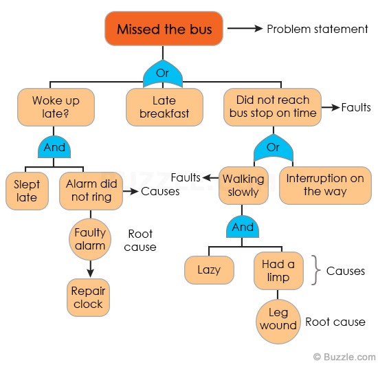 The event is placed at the root (top event) of a “tree of logic”. Each situation causing effect is added to the tree as a series of logic expressions.
